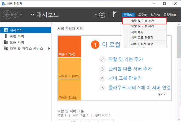 2. [서버 관리자]에서 [관리] 클릭 후 [역할 및 기능 추가] 선택