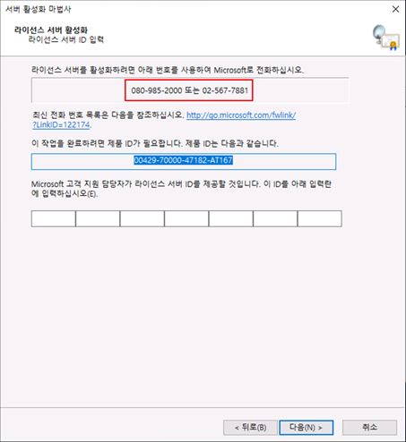 7. 080-985-2000 또는 02-567-7881 전화하여 라이선스 서버 ID 확인 입력 후 [다음] 클릭