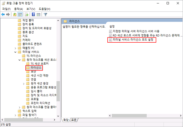 5. 그룹 정책 편집기에서 [관리 템플릿] > [Windows 구성 요소] > [터미널 서비스] > [원격 데스크톱 세션호스트] > [라이선스]로 이동