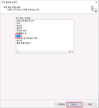 6. [국가 또는 지역 선택]에서 [한국] 선택 후 [다음] 클릭