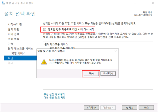 11. [필요한 경우 자동으로 대상 서버 다시 시작] 체크 후 [예] 클릭
