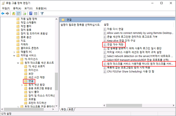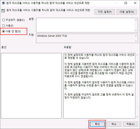 4. [원격 데스크톱 서비스 사용자를 하나의 원격 데스크톱 서비스 세션으로 제한] 항목을