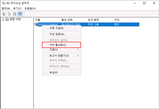 3. 마우스 우클릭하여 메뉴 중 [서버 활성화] 선택