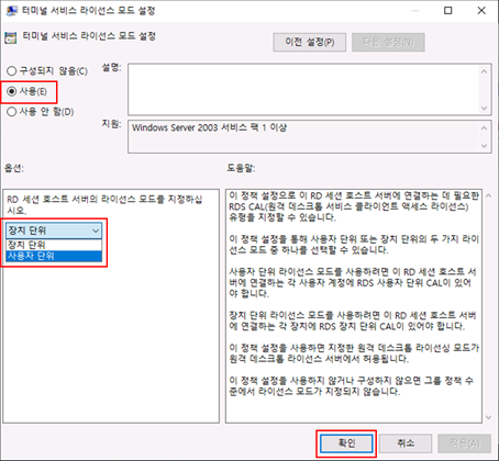6. [터미널 서비스 라이선스 모드 설정]을 선택하여 [사용] 선택 후 [RD 세션 호스트 서버의 라이선스 모드를 지정하십시오.]에서 [장치 단위] 또는 [사용자 단위] 선택 후 [확인] 클릭
