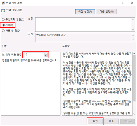 3. [연결 개수 제한]을 ‘사용’으로 선택, 옵션 항목의 TS 최대 허용 연결 수 입력 후 [확인] 클릭
