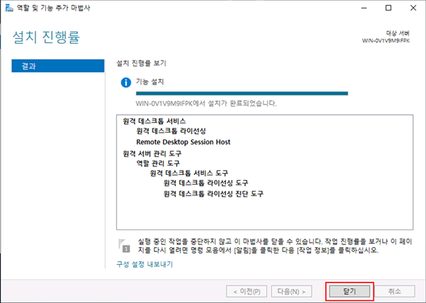 13. [닫기] 클릭 후 서버 자동 재부팅