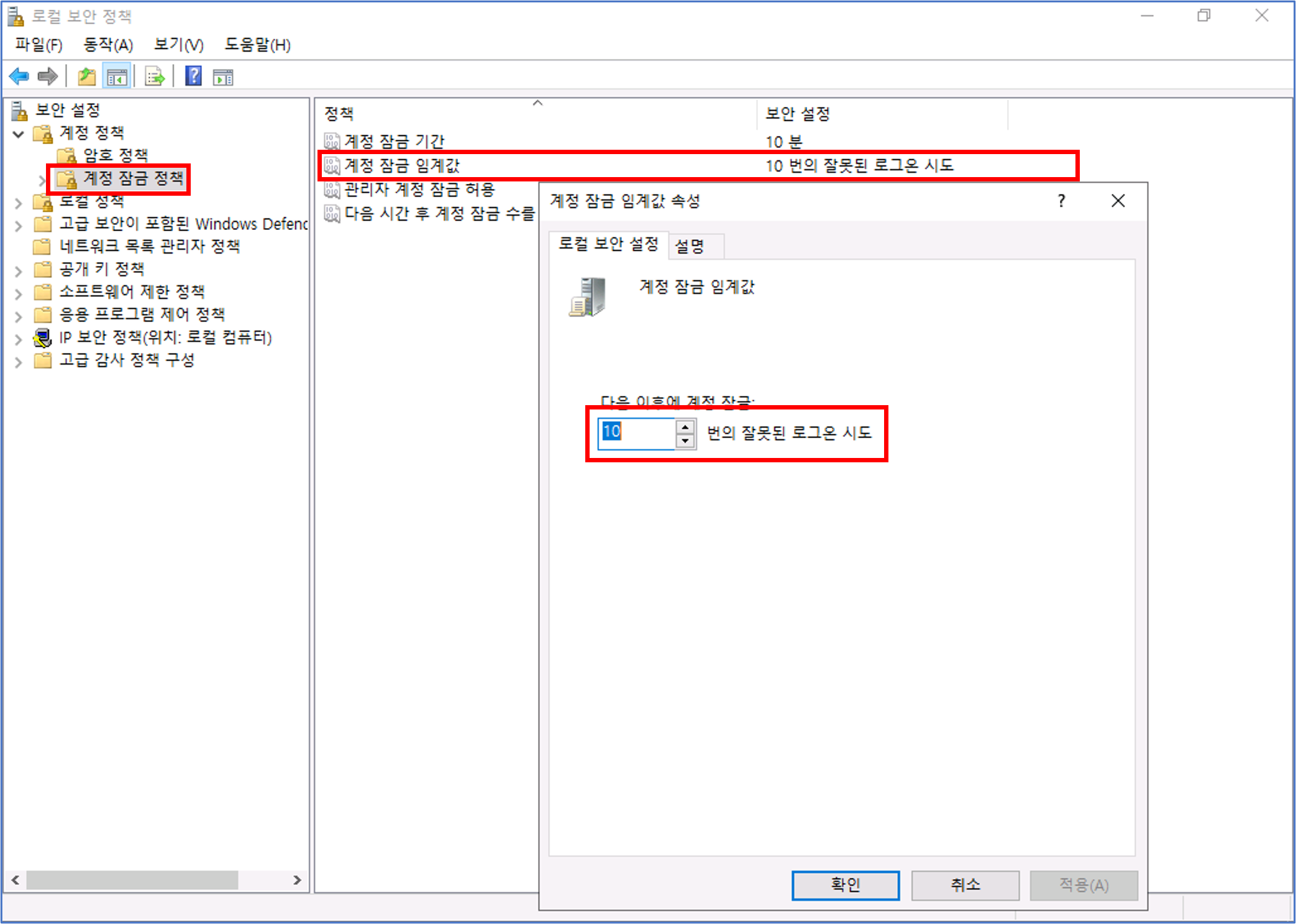 계정 잠금 임계 값이 5 이하의 값으로 설정되어 있는 경우