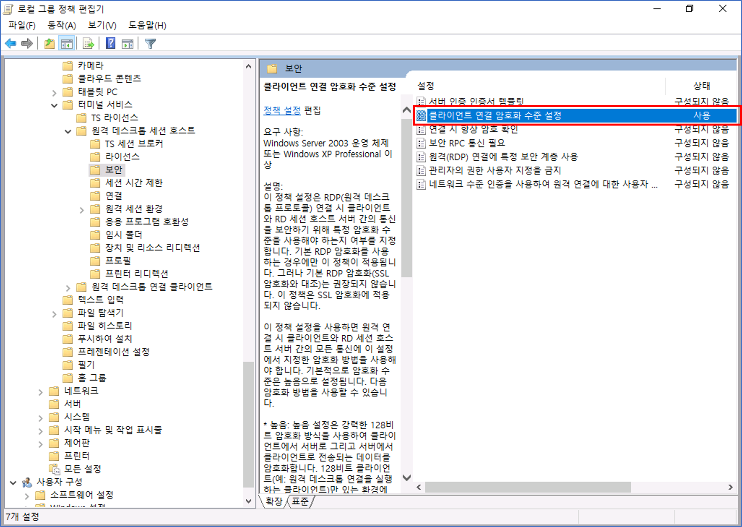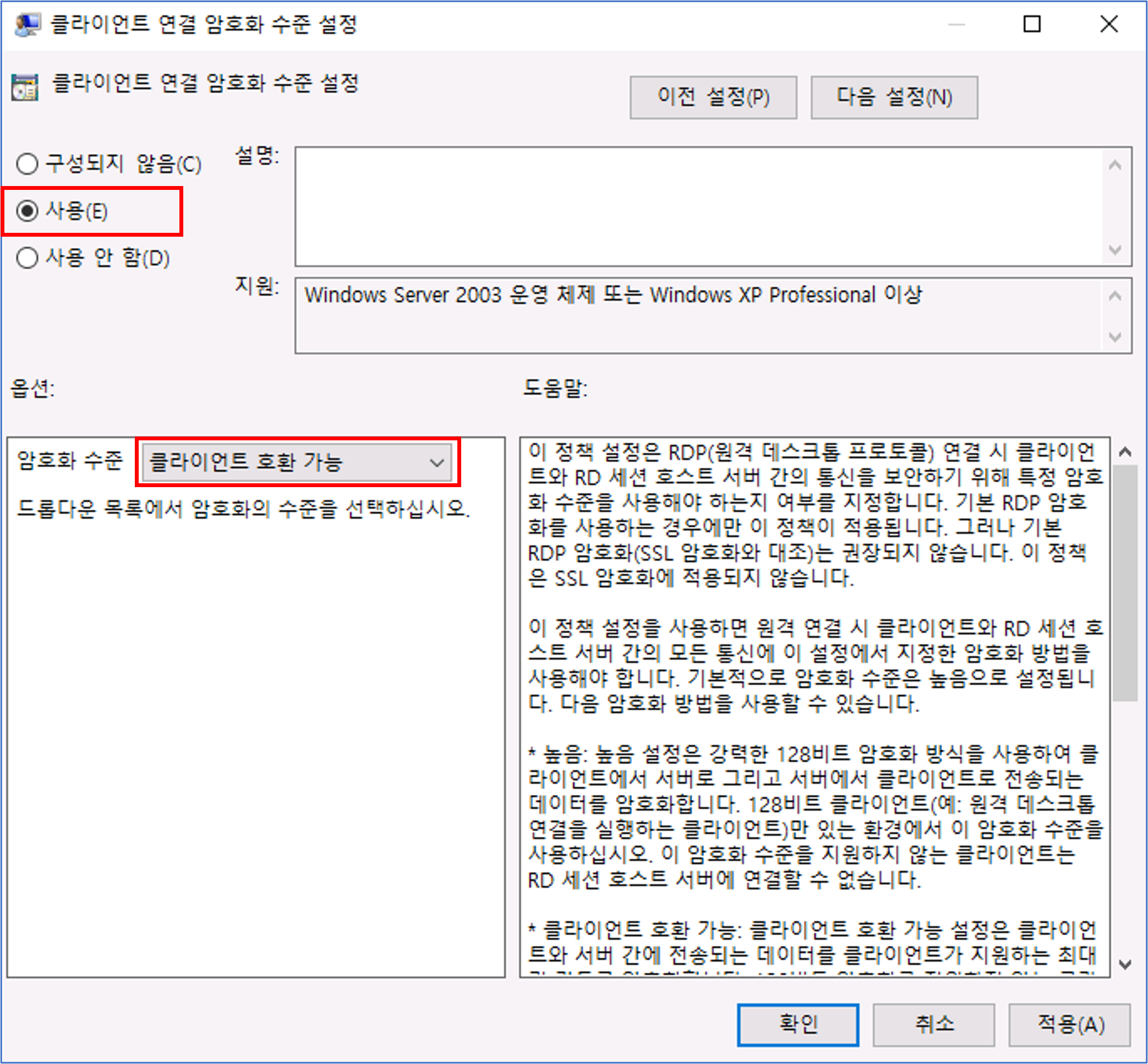 터미널 서비스를 사용하지 않거나 사용 시 암호화 수준을 "클라이언트와 호환 가능(중간)" 이상으로 설정한 경우