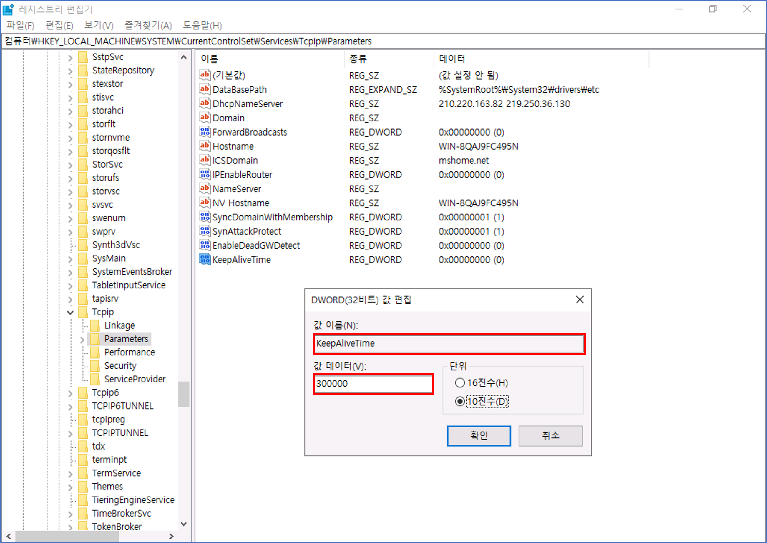 - KeepAliveTime = REG_DWORD 300,000(5분)