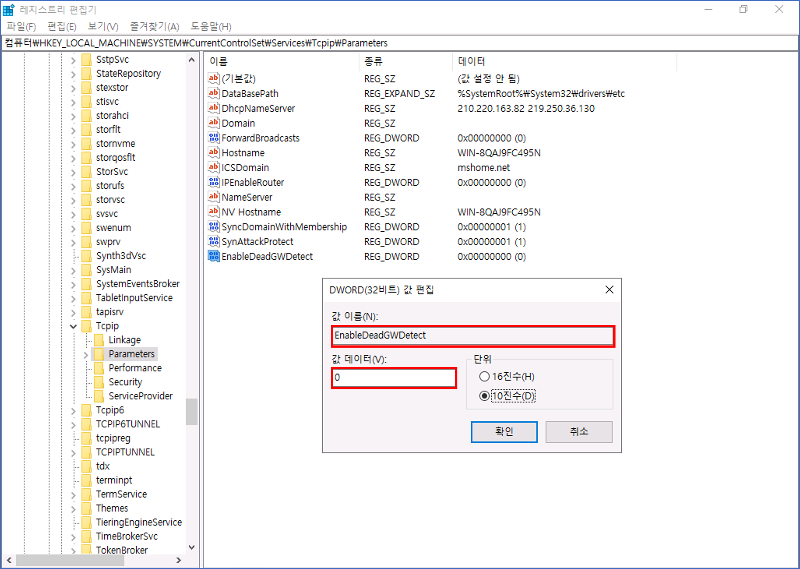 DoS 방어 레지스트리 값이 아래와 같이 설정되어 있는 경우