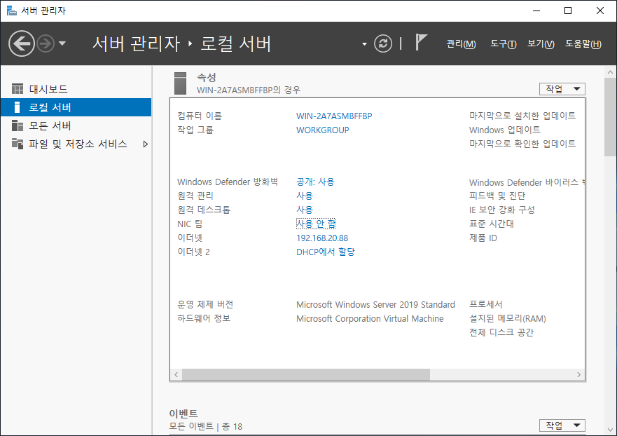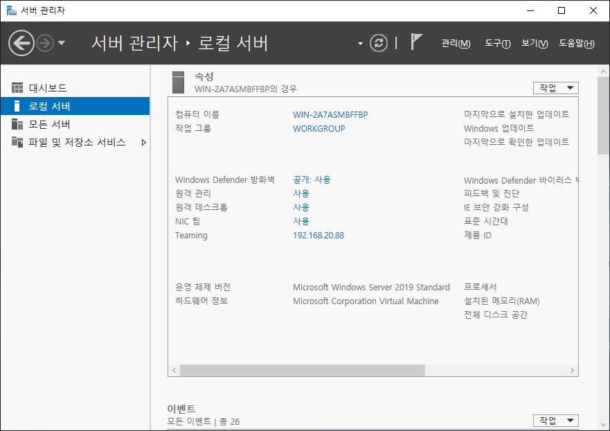 [서버 관리자]에서 [로컬 서버] 선택 후 [NIC 팀] "사용 안 함"을 선택합니다.