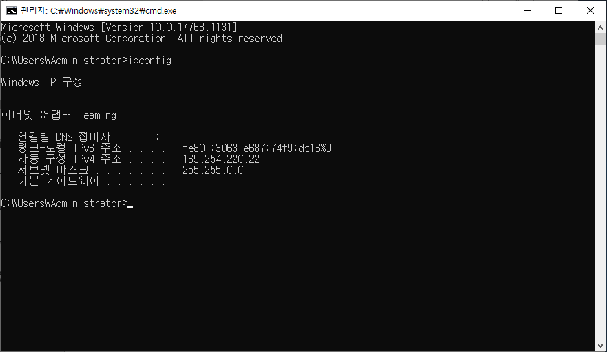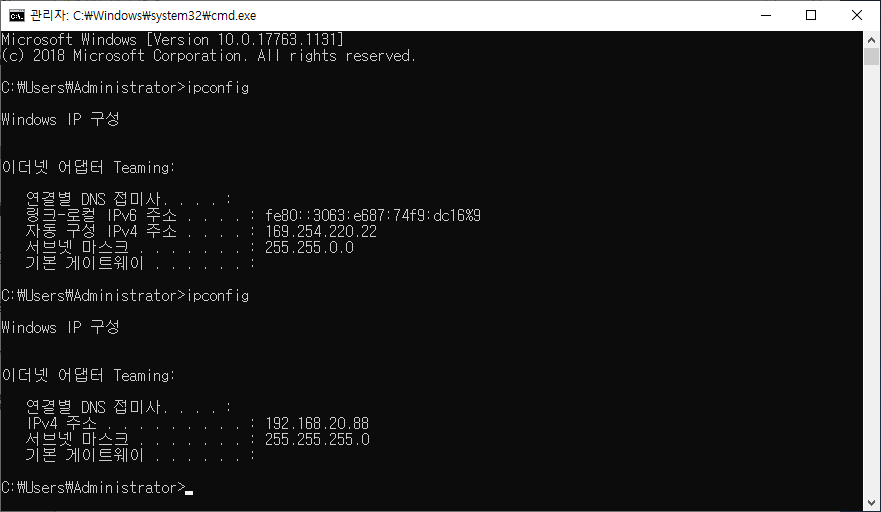 티밍(Teaming)구성 되면 기존에 설정 되어있던 IP가 사라지니 주의 바랍니다.