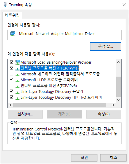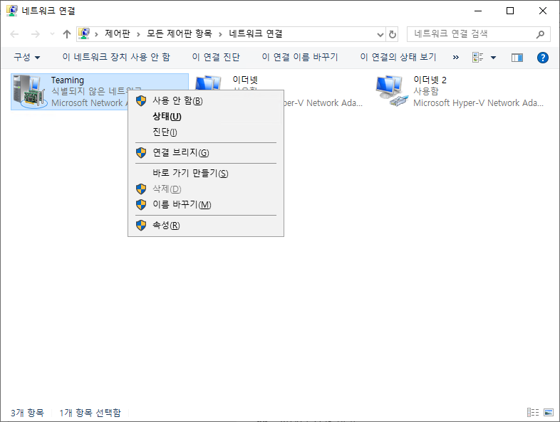 "제어판 > 모든 제어판 항목 > 네트워크 연결" 에서 [팀 이름]으로 설정 된 "Teaming"에서 마우스 우클릭하여 속성을 선택합니다.