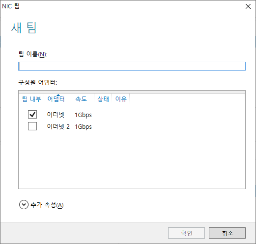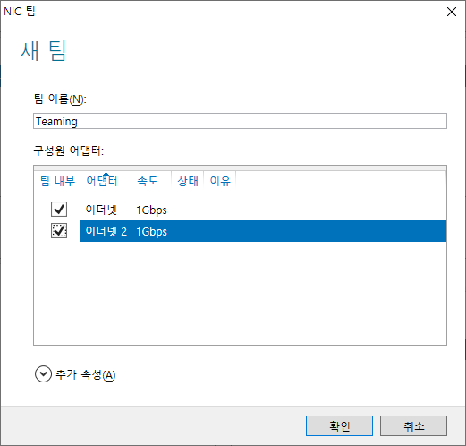 "팀 이름(N)" 사용 할 이름을 입력 후 [구성원 어댑터]에 티밍 할 이더넷을 체크 합니다.