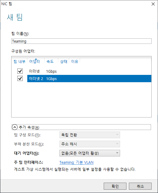 티밍(Teaming)은 여러 네트워크 어댑터(NIC)를 Team으로 만들어서 사용하는 것으로 기본 대역폭의 상승과 트래픽 분산이 가능합니다.