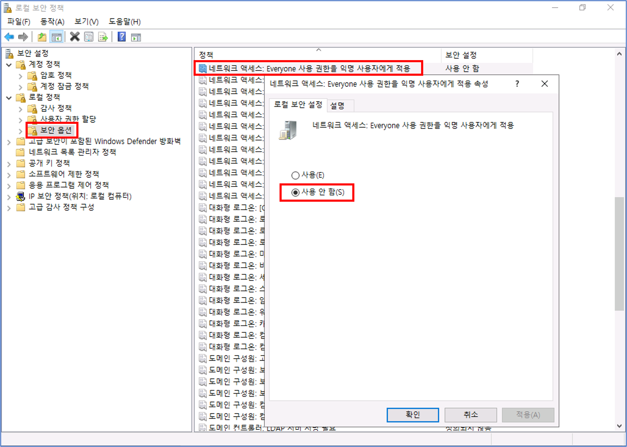 "Everyone 사용 권한을 익명 사용자에게 적용 정책이 "사용 안 함"으로 되어 있는 경우